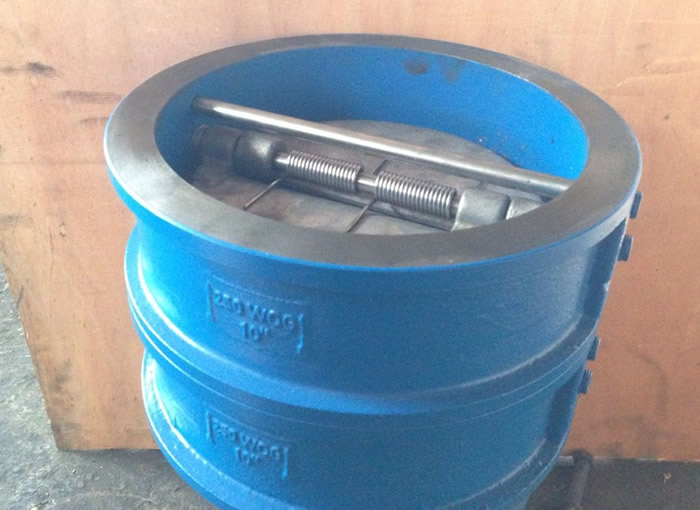 Check valve shall be of the double disc, wafer style with torsion spring induced closure. Valve shall be Wafer style for bolting between ANSI Class 125 flanges. Valves have a Cast Iron body (ASTM A-126, CL. B) to fit inside 125# ANSI bolt circles, a two piece Bronze disc (ASTM B-62, 85-5-5-5), type 316 Stainless Steel dual shafts, type 316 Stainless Steel torsion spring and have an integrally molded elastomer seat vulcanized to the body. Valve for horizontal flow shall be installed with the shafts in vertical position.